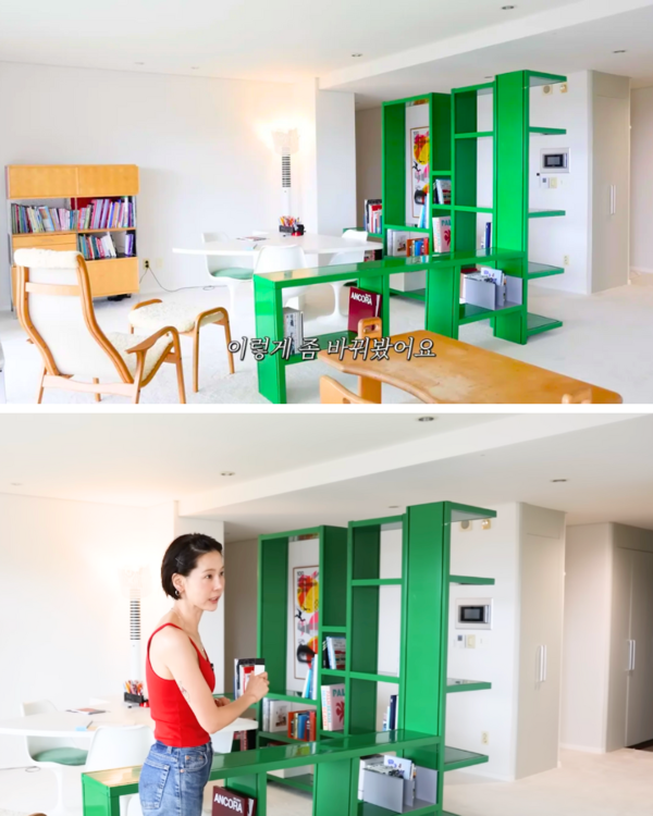 유독 초록색 가구 배치를 좋아하는 김나영이 최근 아르떼미데의 빈티지 북케이스를 집안에 들였다. 아르떼미데의 녹색은 특히 생동감이 넘치는 그리너리의 정수. 1970년대에 제작된 도도나의 ABS 플라스틱 모듈 선반으로 시대적 감각을 품고 있다. 구조적 조형미와 실용성을 함께 지녔으며, 책장은 물론 오브제를 전시하는 가구로도 활용도가 아주 높다. 칙칙한 거실에 이 북케이스 하나만 잘 놓아도 공간 전체에 활기를 불어넣는다.