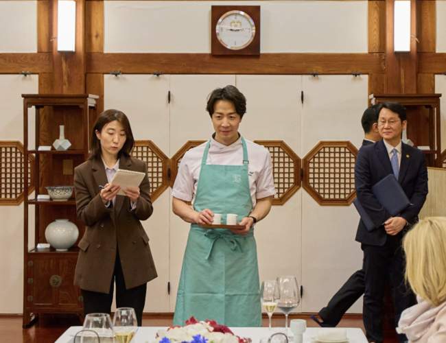 이날 만찬에서 손종원 셰프는 한국 식재료와 프랑스식 조리 기법을 결합한 6가지 코스 요리를 선보였다. 전채로는 ‘잡채 타르틀렛’, 이어 삼계탕을 재해석한 ‘삼계 룰라드’, 메인으로는 한우 채끝과 전복을 활용한 ‘한우 밀푀유’가 제공됐다. 디저트로는 ‘군고구마 크레이프’가 자개함에 담겨 나오는 등 시각적인 연출까지 더해 눈길을 끌었다.