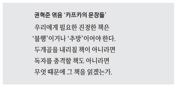 '우리가 필요로 하는 책은 우리를 심하게 아프게 하는 불행과 같고, 우리가 자신보다 더 사랑한 사람의 죽음과 같고, 마치 우리가 모든 사람에게 버림을 받고 멀리 추방된 상태와 같고, 자살과 같은 그런 충격을 주는 책들이어야 한다. 우리가 읽는 책이 주먹으로 두개골을 내리치는 것이 아니라면, 무엇 때문에 그 책을 읽는단 말인가?'
