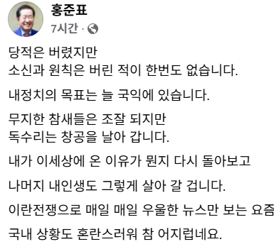 홍 전 시장은 “내가 이 세상에 온 이유가 뭔지 다시 돌아보고 나머지 내 인생도 그렇게 살아갈 것”이라며 “이란 전쟁으로 매일매일 우울한 뉴스만 보는 요즘 국내 상황도 혼란스러워 참 어지럽다”고 덧붙였다.