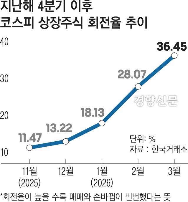 지난달 코스피 상장주식 회전율은 36.45%로 ‘동학개미 운동’ 당시인 지난 2021년 7월(37.58%) 이후 가장 높았다. 지난 1월(18.13%)과 비교하면 두 배 가량 늘어난 수치다. 상장주식 회전율이 높다는 것은 투자자들이 단기간 빈번하게 사고팔았다는 뜻으로, 손바뀜이 활발히 일어난 것이다.