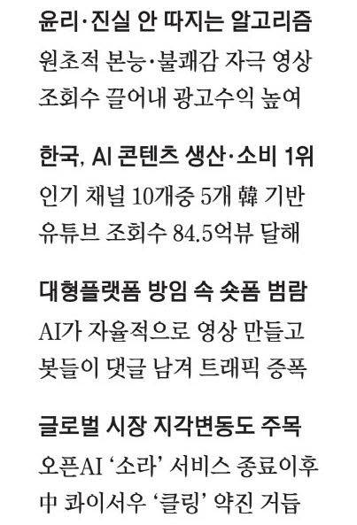 플랫폼의 사각지대와 방임도 문제다. 국내 트래픽을 장악한 유튜브 등 해외 플랫폼들이 한국어 뉘앙스를 완벽히 필터링하지 못하는 사이, 낚시성 섬네일과 AI 보이스로 무장한 슬롭들이 추천 알고리즘을 장악했다는 지적이다. 글로벌 동영상 제작 플랫폼 카프윙은 "AI 관련 허위 정보나 잘못된 정보를 퍼뜨리는 영상들의 주된 목적은 시청자의 관심을 끄는 것"이라면서 "이러한 유형의 콘텐츠를 피하기는 점점 더 어려워지고 있다"고 진단했다.
