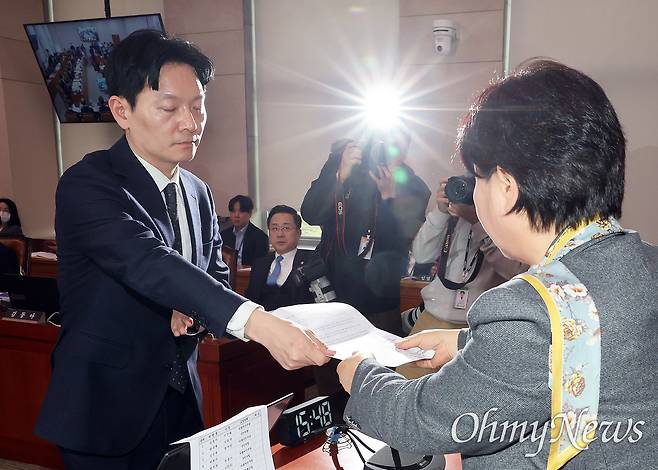 | ▲ '선서 거부' 소명서 제출하는 박상용 검사 수원지검이 쌍방울 대북송금 사건 수사 당시 이화영 전 경기도 평화부지사의 진술 회유를 위해 '연어 술 파티'를 열었다는 의혹의 당사자인 박상용 당시 수원지검 부부장검사가 3일 서울 여의도 국회에서 열린 '윤석열 정권 정치검찰 조작기소 의혹 사건 진상규명 국정조사특별위원회(조작기소 국조특위)' 전체회의에 출석해 증인 선서를 거부하는 소명서를 서영교 위원장에게 제출하고 있다. |