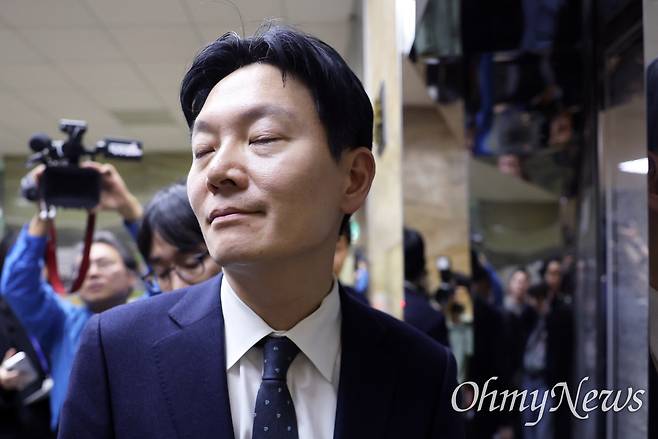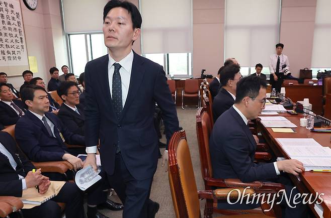 | ▲ 퇴장 조치 당한 박상용 검사 증인 선서를 거부해 퇴장 조치 당한 박상용 검사가 3일 서울 여의도 국회에서 열린 '윤석열 정권 정치검찰 조작기소 의혹 사건 진상규명 국정조사특별위원회(조작기소 국조특위)' 전체회의가 열린 회의장 밖 복도에서 승강기로 향하고 있다. |