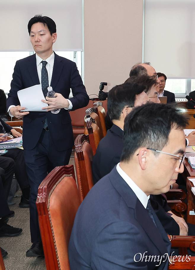 | ▲ 증인선서 거부한 박상용 검사 수원지검이 쌍방울 대북송금 사건 수사 당시 이화영 전 경기도 평화부지사의 진술 회유를 위해 '연어 술 파티'를 열었다는 의혹의 당사자인 박상용 당시 수원지검 부부장검사가 3일 서울 여의도 국회에서 열린 '윤석열 정권 정치검찰 조작기소 의혹 사건 진상규명 국정조사특별위원회(조작기소 국조특위)' 전체회의에 출석해 증인 선서를 거부한 뒤 소명하려다 마이크를 빼앗기고 발언하고 있다. 오른쪽 앞은 이진수 법무부 차관. |