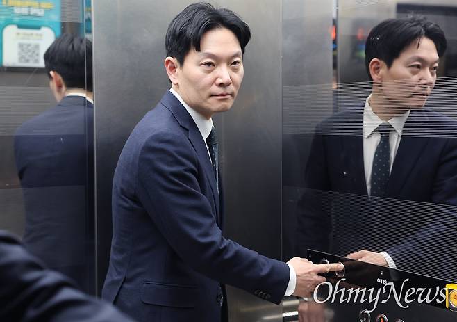 | ▲ 퇴장 조치 당한 박상용 검사 증인 선서를 거부해 퇴장 조치 당한 박상용 검사가 3일 서울 여의도 국회에서 열린 '윤석열 정권 정치검찰 조작기소 의혹 사건 진상규명 국정조사특별위원회(조작기소 국조특위)' 전체회의가 열린 회의장 밖 복도에서 승강기에 올라 타 있다. |