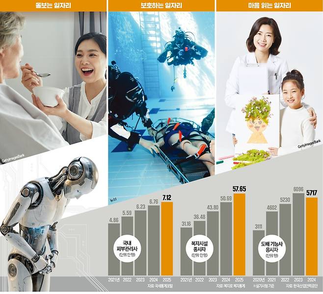 이 밖에 고객 얼굴을 마주해야 하는 헤어디자이너와 피부관리사도 매년 최대치를 기록하고 있다. 돌봄도 AI가 대체하기 어렵다. 사회복지 인력을 육성하는 기관이 급증하고 있다. 교감 능력이 탁월한 40대 이상 여성의 취업률은 매년 증가하고 있다.