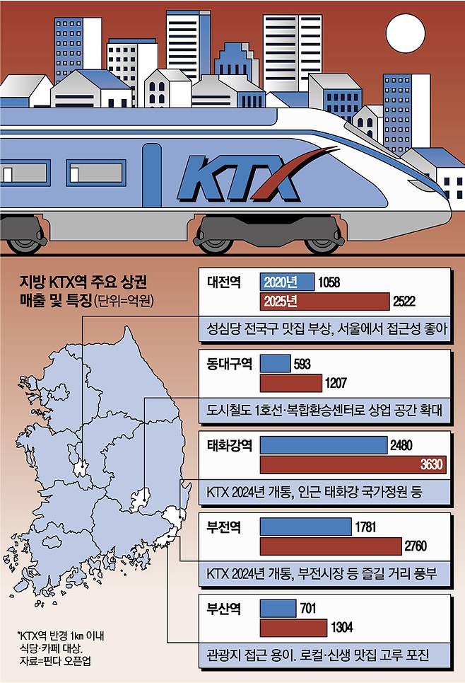 3일 상권 분석 서비스 오픈업에 따르면 비수도권 지역 KTX역 65곳의 반경 1㎞ 안에 있는 음식점·카페의 2020년 총매출이 1조8186억원에서 지난해 2조7613억원으로 52% 뛰었다. 5년 새 무려 1조원 가까이 증가한 것이다.