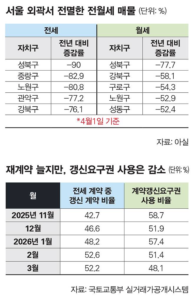 1년 전과 비교하면 상황은 더 심각하다. 성북구 전세 매물은 전년 동월 대비 90% 감소했으며, 중랑구·노원구·관악구·강북구·금천구 등 서울 외곽 자치구의 전세 매물도 70~80% 이상 줄어들었다. 전세 절벽의 타격을 비껴간 건 용산구(-36.6%), 서초구(-31.8%), 강남구(-19.5%), 송파구(9.9%) 등 집값이 상대적으로 높은 지역이었다.