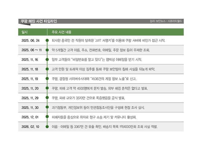 쿠팡의 해킹 사건은 △2025년 6월 24일 시작됐다. 퇴사한 중국인 전 직원이 탈취한 ‘JWT 서명키’를 이용해 쿠팡 서버에 몰래 접근했다. 이후 △11월까지 5개월간 고객 이름, 주소, 전화번호, 이메일, 주문 정보 등이 무제한으로 조회됐다. △11월 16일 일부 고객들이 ‘비밀번호를 알고 있다’는 내용의 이메일을 받기 시작했고, △11월 18일 고객 민원과 트래픽 이상 징후를 통해 쿠팡 보안팀이 침해 사실을 알게 됐다. △11월 19일 쿠팡은 경찰청 사이버수사대에 ‘약 4500건의 계정 정보’가 노출됐다며 신고했으며, △11월 30일 과기정통부와 개인정보위 등이 포함된 ‘민관합동조사단’이 구성돼 현장 조사를 실시했다. 그리고 △2026년 2월 10일 이름과 이메일 등 3367만건 유출이 확인됐으며, 배송지 목록 1억4000만건이 조회된 사실이 있다는 내용의 정부 조사 결과가 발표됐다.