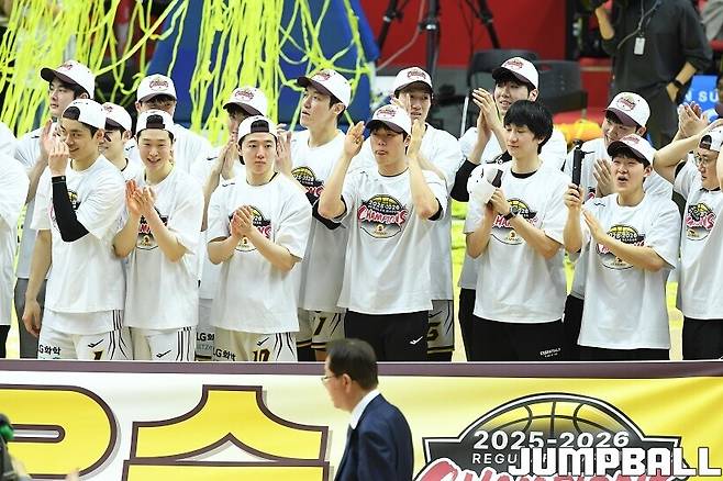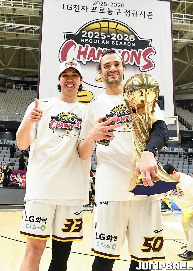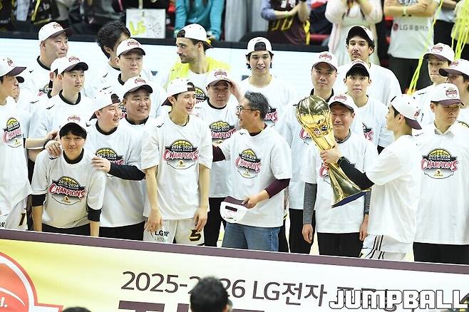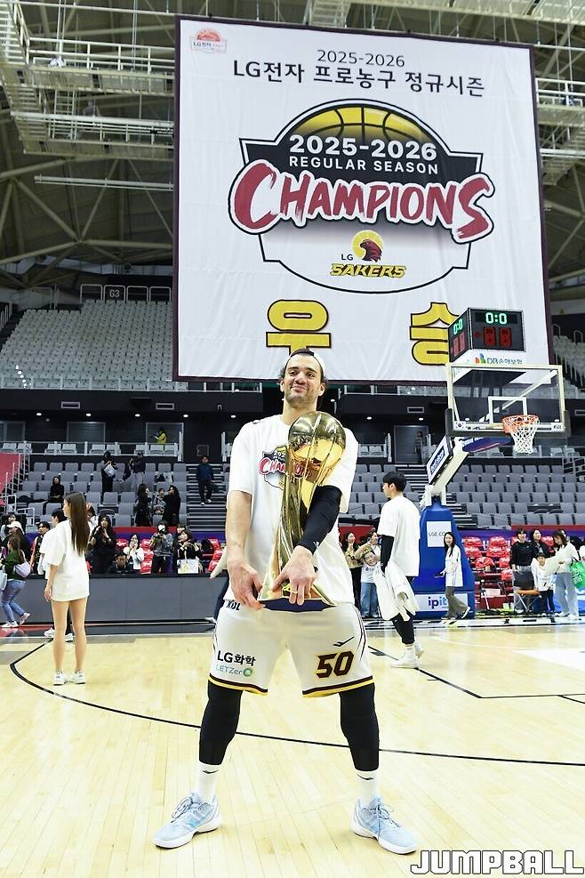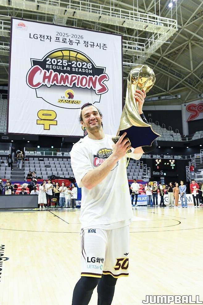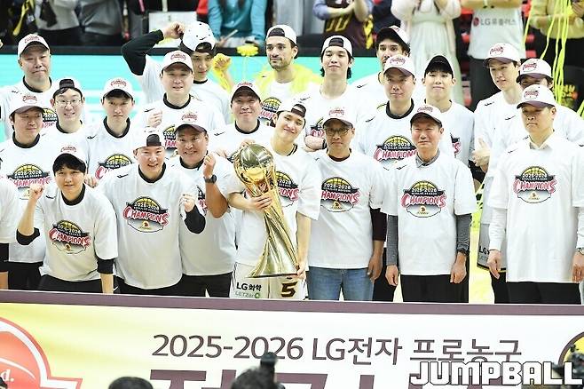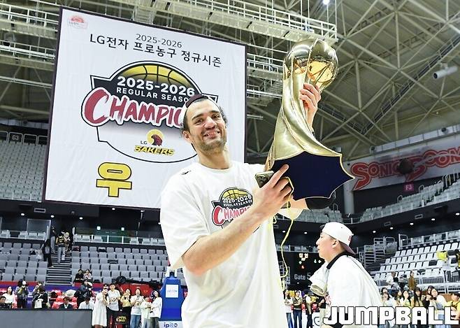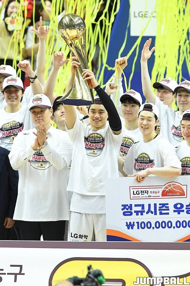 [점프볼=수원/유용우 기자] 3일 KT 소닉붐 아레나에서 열린 2025-2026 LG전자 프로농구 수원 KT와 창원 LG의 경기, 아셈 마레이가 21점 15리바운드 8어시스트 1스틸 2블록을 기록하며 맹활약한 가운데, LG가 87-60으로 KT에 승리하며 정규리그 우승을 확정지었다.