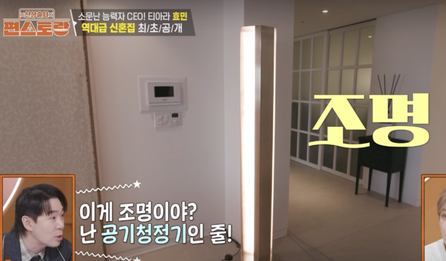 특히 이날 효민은 신혼집을 공개해 시선을 모았다. 높은 층고와 탁 트인 한강 뷰를 자랑하는 집이 갤러리를 연상케할 정도. 고급 인테리어가 감탄을 자아냈다. 무려 4개월을 기다려 구매했다는 조명을 비롯, 개방형 테라스에선 불멍아 가능한 난로까지 갖춰진 공간으로 눈길을 끌었다.