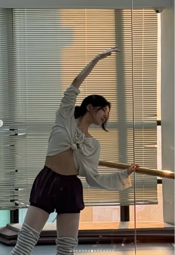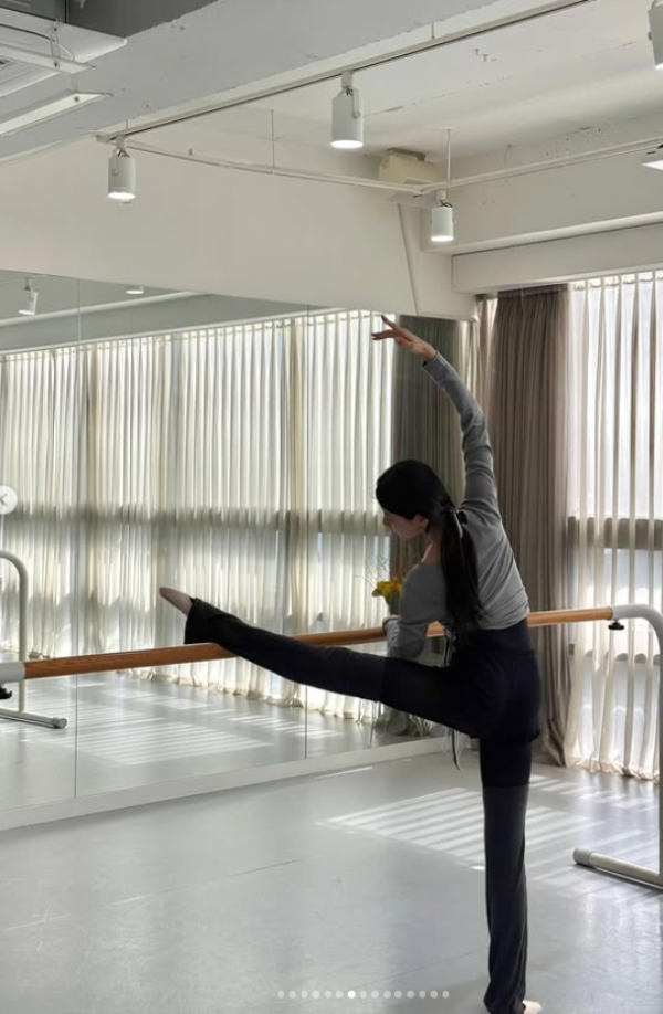 수지는 발레 바에 다리를 가볍게 올리거나 바닥에 앉아 부드럽게 다리를 뻗으며 남다른 유연성을 자랑했다.