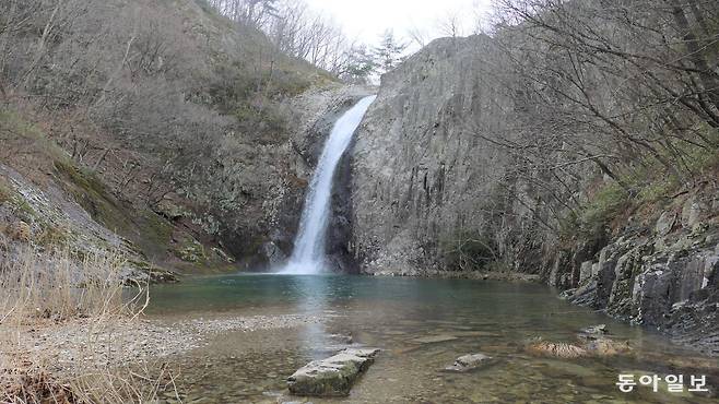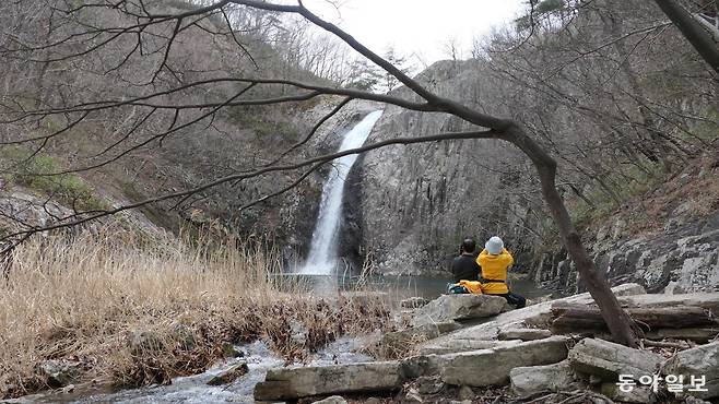 신록이 시나브로 영역을 넓혀 가는 즈음이라 산이 물을 내놓는지 오솔길 군데군데가 질퍽하다. 계곡을 발아래 두고 걷다 보니 물소리가 점점 우렁우렁해진다. 폭포를 원경으로 볼 수 있도록 만든 전망대에 서니 저 멀리 하얀 폭포 줄기가 거대한 암벽을 둘로 가르며 떨어진다. 그 물은 거세게 흘러와 전망대 바로 아래에서 다시 조그만 폭포를 만들어 낸다. 더 걷는다.