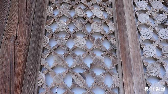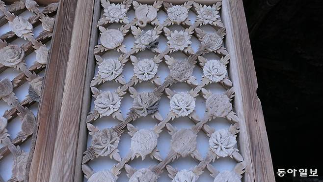 내소사 대웅보전 정면 여덟 문짝은 꽃살문이다. 위에서부터 연꽃, 모란, 국화 꽃살문.