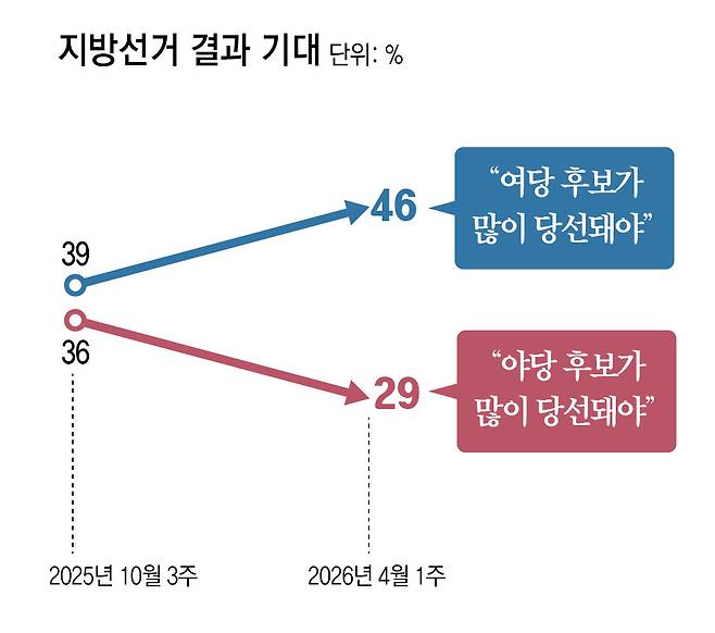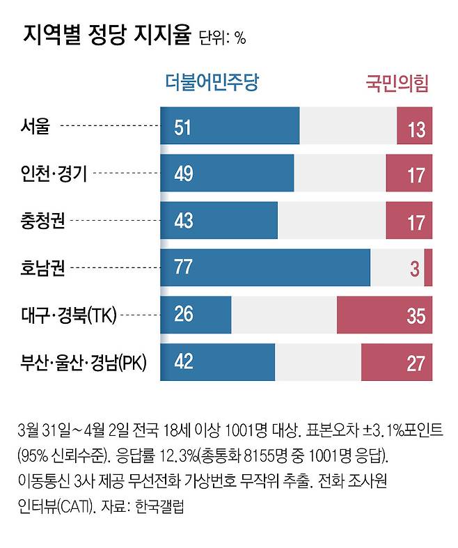 민주당은 서울(51%) 경기·인천(49%) 충청권(43%) 부산·울산·경남(42%) 등 핵심 승부처에서 모두 국민의힘에 앞섰다. 민주당은 2022년 지방선거에서 국민의힘이 차지한 12곳 중 인천 대구 울산 강원 경남 경북 등 6곳의 공천을 빠르게 확정하며 표심 공략에 한발 빠르게 나서는 모습이다. 김 전 총리가 3일 대구시장 후보 면접 직후 단수 공천을 받으면서 민주당은 16개 광역단체장의 경선 및 공천 여부를 선거 두 달 전에 마무리했다.