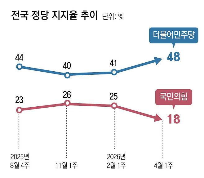 한국갤럽이 지난달 31일∼이달 2일 조사해 3일 발표한 여론조사(전화면접 방식·95% 신뢰 수준에 표본오차 ±3.1%포인트·자세한 사항은 중앙선거여론조사심의위원회 홈페이지 참조)에 따르면 민주당 지지율은 48%로 지난해 6월 4일 이재명 정부 출범 이후 가장 높았다. 반면 국민의힘 지지율은 18%로 이재명 정부 출범 이후 가장 낮았다. 양당의 지지율 격차가 30%포인트로 벌어진 것은 이재명 정부 출범 후 처음이다. 직전 최대 격차는 지난주 민주당 46%, 국민의힘 19%로 27%포인트 차였다.