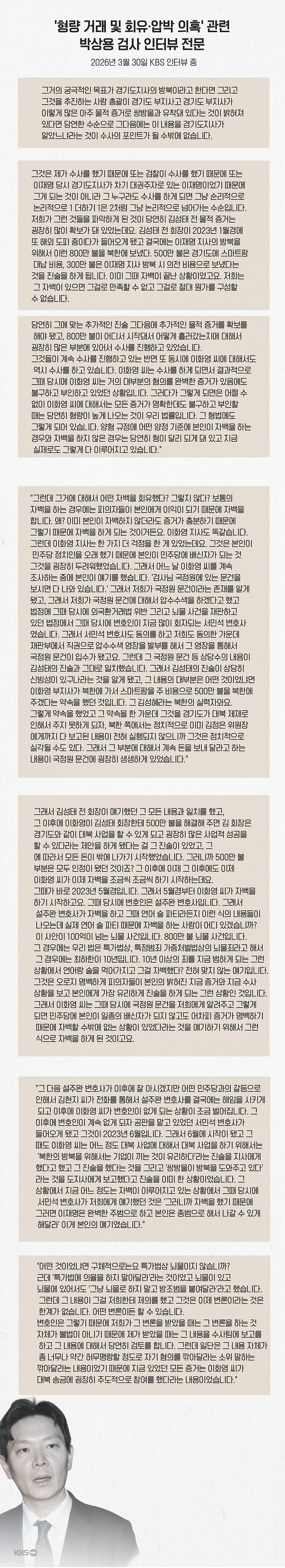 또 박상용 검사의 입장을 충실히 반영하기 위해 지난달 30일 직접 만나 2시간가량 인터뷰를 진행해 보도했습니다. 박 검사는 관련 보도에 대해, "이 전 부지사 측이 제안한 형량 거래를 거절한 것일 뿐"이라며 회유 의혹을 거듭 부인했습니다. ‘회유 의혹’ 박상용 “자백·선처 설명한 것”…서민석 ‘추가 폭로’ 예고