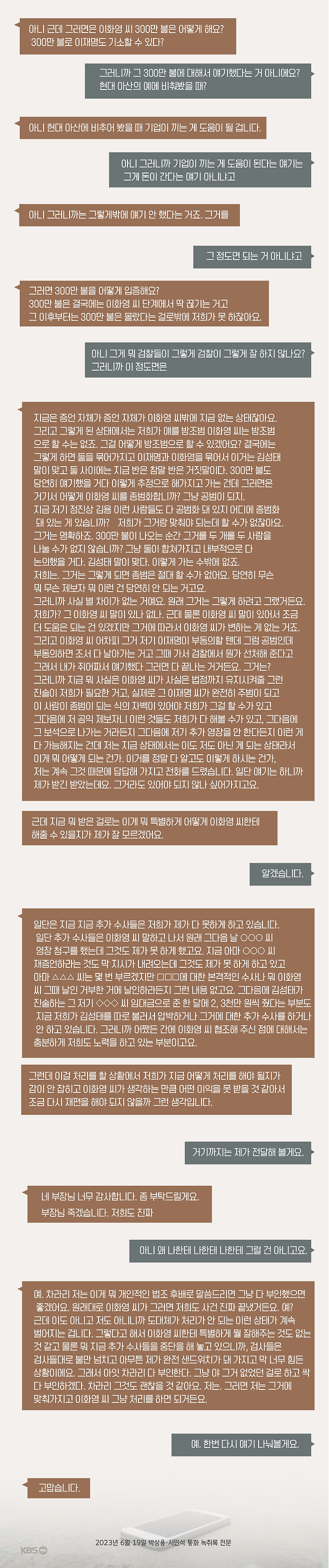 KBS는 시청자들이 맥락을 그대로 판단할 수 있도록, 오늘(3일) 국정조사특별위원회 전체회의에서 공개된 2023년 6월 19일 자 통화 녹취록 [전문]을 공개합니다.