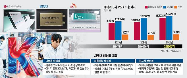 LG에너지솔루션은 지난해 R&D에 1조 3275억 원을 투입해 1년 전보다 22% 늘었고, 삼성SDI도 9% 증가한 1조 4209억 원을 R&D에 투자했다. SK온 역시 3121억 원으로 2024년보다 12% 이상 늘렸다.