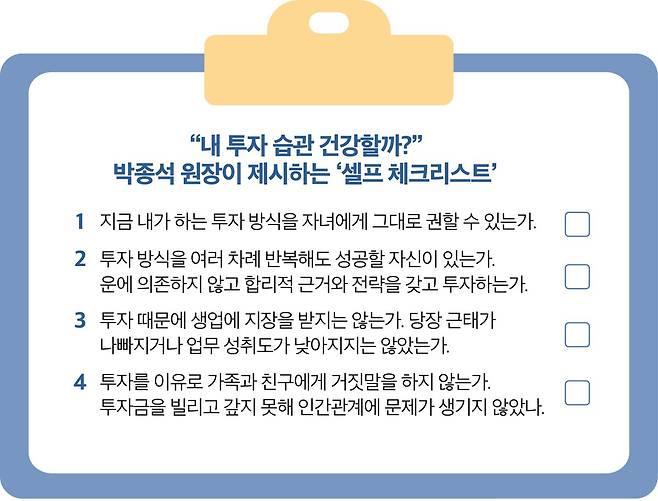 "투자 손실로 많이 힘들겠지만 자책하지 말고, 남 탓도 하지 않았으면 좋겠다. 주식 중독이 심하다면 한동안 투자를 멈추고 본업에 집중하면서 뇌를 쉬게 할 필요가 있다. 최고 우량주는 나 자신임을 잊지 말자."