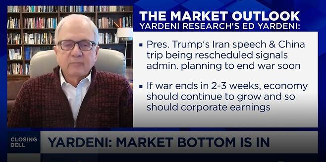 야네디 설립자는 "중요한 건 ‘출구 전략’이다. 시장은 이 전쟁이 끝없이 이어질 수 있다는 점을 매우 우려했다. 가장 명확한 시나리오는 트럼프 대통령이 '이겼다'라고 선언하고 빠져나오는 것이었고, 실제로 어젯밤 연설에서 그런 식으로 행동했다. 그래서 지난 월요일이 바닥이라고 본다"라고 설명했습니다.