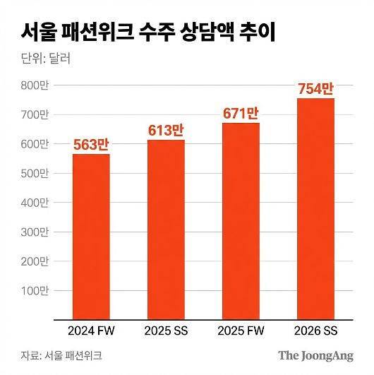 K패션 인기는 숫자가 보여준다. 매 시즌 동대문 디자인 플라자(DDP)에서 열리는 서울 패션위크에서 바이어 수주 상담액은 늘고 있다. 지난 2025년 봄·여름에는 613만 달러(약 93억원), 가을·겨울에는 671만 달러(약 101억원)를 기록했고, 올해 2월 열린 2026 봄·여름에는 754만 달러(약 114억원) 규모의 성과를 기록했다.