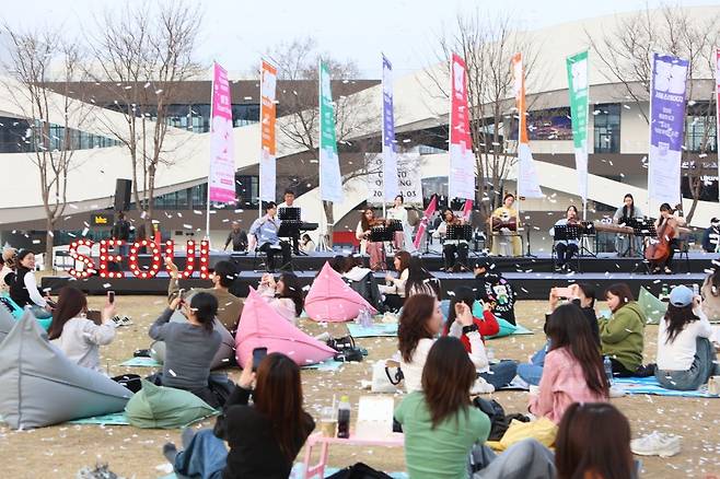 'K-뮤직'이라는 이름이 과장이 아니라는 것을, 무대는 차분하게 증명하고 있었다. 그러나 이날 공연의 진짜 주인공은 따로 있었다. 무대 아래, 잔디 위였다. 형형색색의 빈백과 돗자리가 펼쳐진 공간 위에서 사람들은 각자의 방식으로 공연을 즐기고 있었다. 연인들은 치킨을 나눠 먹으며 음악에 귀를 기울였고, 가족 단위 관객들은 아이들과 함께 봄 저녁을 보내고 있었다. 캔 음료를 따는 소리와 웃음소리가 음악 사이를 메웠다.