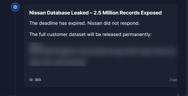 국제 랜섬웨어 조직 에베레스트는 3일 다크웹 유출 전용 사이트에 '닛산 데이터베이스(DB) 유출-기록 250만건 유출'이라는 제목의 게시글을 올리며 "기한이 만료됐고 닛산은 응답하지 않았다, 전체 고객 데이터셋이 영구적으로 공개될 예정"이라고 밝혔다. 해당 게시글 아래에는 탈취한 정보 파일에 접근할 수 있는 사이트 주소가 명시돼 있다.