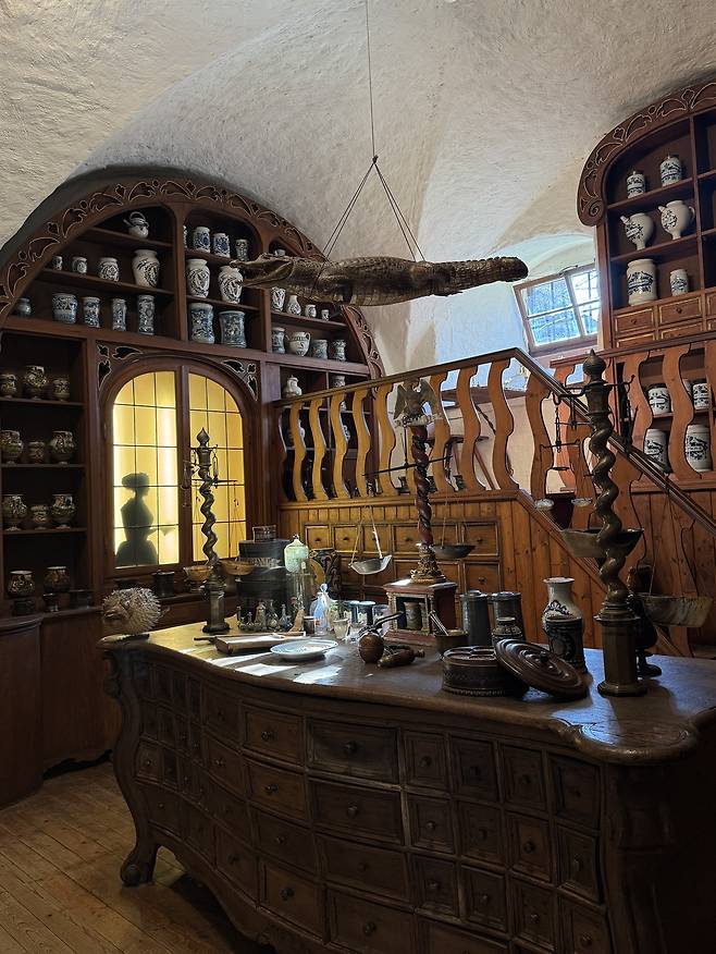 | ▲ 과거 약국의 모습을 재현해놓은 전시. 천장엔 '힘'을 상징하는 악어가 매달려있다. 평소 보기 힘든 생물을 갖다 놓는 약국일수록 인기가 많았다고 한다 |