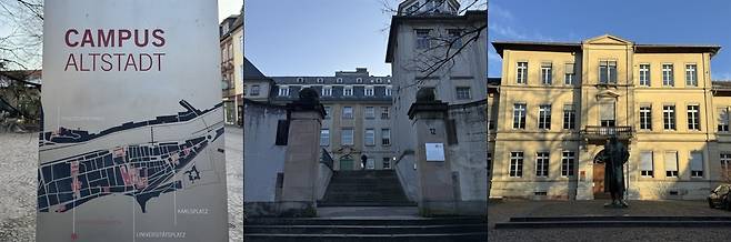 | ▲ 하이델베르크 구시가지에 위치한 대학 건물을 알려주는 지도(좌), 도시 곳곳에 알아차리지도 못하게 대학 건물이 곳곳에 있다(가운데, 우) |