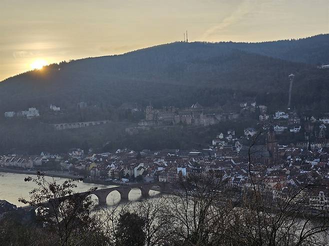 아침에는 또 다른 모습이었다. 강 위에는 고요하게 안개가 깔려 있었고 적막함이 공기를 덮었다. 20분 정도 산책을 이어가자, 하이델베르크성 뒤편에서 힘차게 떠오르는 햇빛이 도시를 서서히 비추며 전혀 다른 분위기를 만들어냈다.