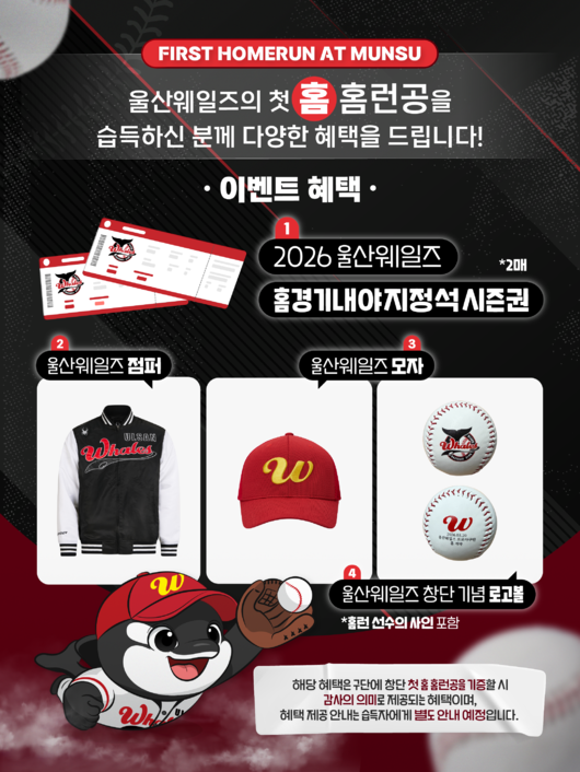 구단은 문수야구장 담장을 처음 넘는 역사적인 ‘창단 첫 홈런공’을 기증하는 팬에게 다양한 선물을 제공한다. 특히 이번에는 올 시즌 홈경기 내야 지정석 시즌권 2매를 새롭게 추가하며 혜택을 크게 늘렸다.