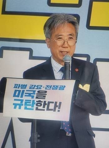 그는 "이들이 지금 우리 국민들을 총알받이로 내세우겠다고 이란 침략전쟁에 참여를 강요한다"며 "우리 젊은이들의 희생을 막아야 한다"고 밝힌 후 '국회는 미군의 책임을 물어라' '정부는 침략전쟁 파병을 거부하라' 등을 외쳤다.