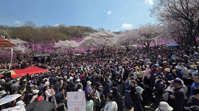 | ▲ 원미산 진달래축제 개막식 2부 공연이 이어지며 관람객들로 행사장이 가득 차 ‘발 디딜 틈 없는’ 인파를 보이고 있다. |