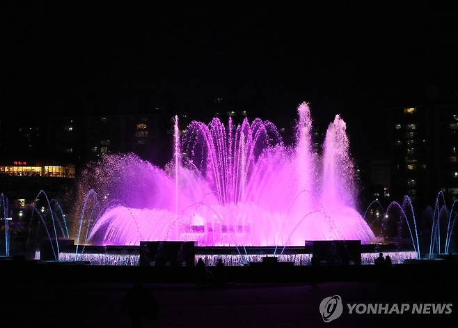 (고양=연합뉴스) 김병만 기자 = 4일 밤 경기도 고양 일산호수공원 노래하는 분수대에서 BTS 대표곡에 맞춰 화려한 분수쇼가 열리고 있다. 2026.4.5