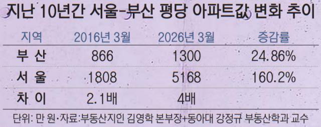10년 전 드라마 대사를 들먹이는 이유가 있다. 2일 부동산 정보 플랫폼 ‘부동산지인’의 김영학 본부장과 동아대 강정규 부동산학과 교수가 분석한 바에 따르면 서울 아파트 3.3㎡(평)당 평균 매매가격은 2016년 3월 1808만 원에서 10년 뒤인 2026년 3월에는 5168만 원으로 160.2%가 올랐다. 반면 부산 아파트의 평당 평균 매매가격은 2016년 3월 866만 원에서 10년 뒤 1300만 원으로 24.9% 오르는 데 그쳤다. 두 도시 간 아파트 평균 매매가격 차이도 2.1배에서 10년 사이 4배로, 배로 증가했다.