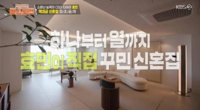 걸그룹 티아라의 멤버이자 사업가로 활동 중인 효민. 그는 지난해 4월 10살 연상의 금융업 종사자 남편과 결혼 소식을 전해 화제를 모았다. 편셰프 출사표를 던진 효민은 이날 방송 최초로 신혼집을 공개했다. 그의 집은 흡사 카페 같은 한강뷰 테라스가 인상적이었다. 전체적으로 깔끔하면서도 모던하고 감각적인 인테리어가 돋보였는데, 특히 변기부터 화장지까지 올블랙으로 맞춘 화장실이 시선을 사로잡았다.