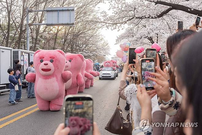 (서울=연합뉴스) 롯데홈쇼핑의 자체 캐릭터 '벨리곰'이 지난 3일 '2026 여의도 봄꽃축제'가 열리는 서울 여의도 윤중로 일대에서 대형 전시와 체험형 콘텐츠를 선보이고 있다. 2026.4.5 [롯데홈쇼핑 제공. 재판매 및 DB 금지]
