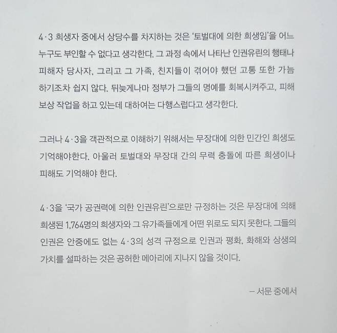 저자는 “4·3 희생자 중에서 상당수를 차지하는 것은 ‘토벌대에 의한 희생임’을 어느 누구도 부인할 수 없다고 생각한다”며 “그 과정 속에서 나타난 인권유린의 행태나 피해자 당사자, 그리고 그 가족, 친지들이 겪어야 했던 고통 또한 가늠하기조차 쉽지 않다. 뒤늦게나마 정부가 그들의 명예를 회복시켜주고 피해보상 작업을 하고 있는데 대해서는 다행스럽게 생각한다”고 밝혔다.