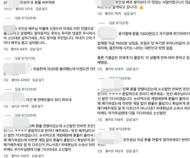 최근 환율이 치솟자 뒤늦게 이를 발견한 극우 성향 네티즌들이 조인성의 최근 SNS 게시물들에 악플을 쏟아내고 있는 것이다.