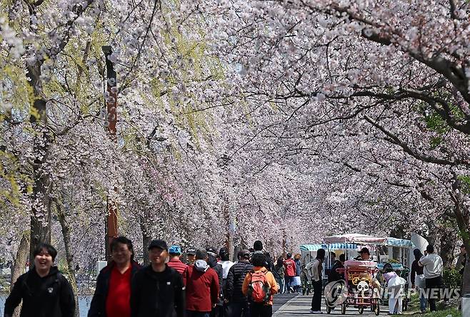(강릉=연합뉴스) 유형재 기자 = '2026 경포벚꽃축제'가 한창인 5일 강원 강릉시 경포호 일원이 온통 만개한 벚꽃으로 꽃대궐을 이루고 있다. 2026.4.5