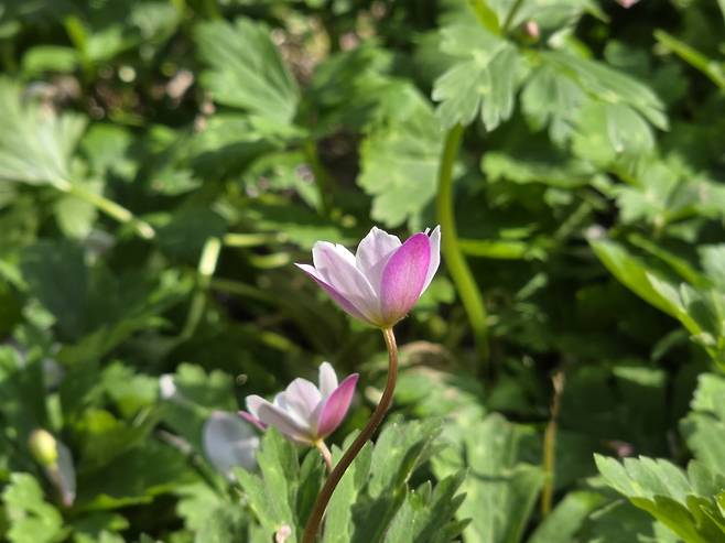 하얀 벚꽃잎이 눈처럼 쌓인 푹신한 흙 위로 뚫고 올라온 연분홍빛 남바람꽃의 조화는, 위를 보아도 아래를 보아도 황홀함 그 자체를 선사합니다.