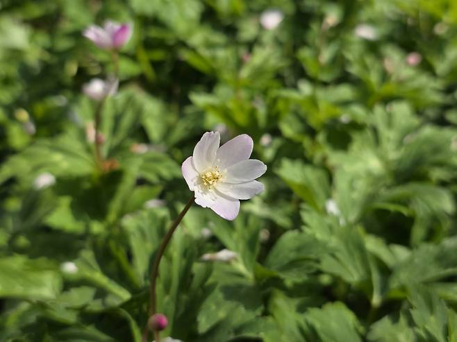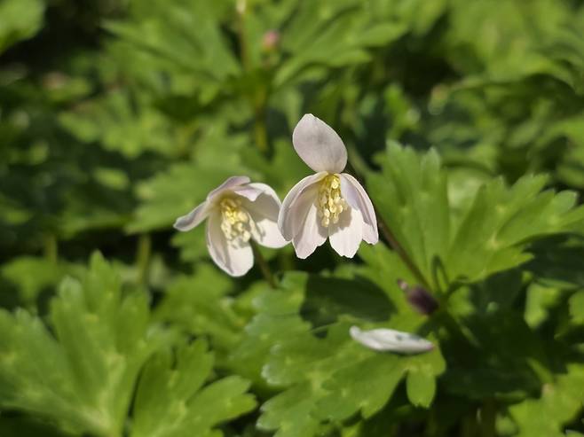 남바람꽃은 참으로 묘한 매력을 지닌 꽃입니다. 벚꽃이 만개할 때는 가만히 숨을 죽이고 있다가, 벚꽃잎이 꽃비가 되어 바닥으로 떨어질 때쯤 시간에 맞춰 수줍게 고개를 내밉니다. 남바람꽃의 꽃말은 '천진난만한 여인'입니다.
