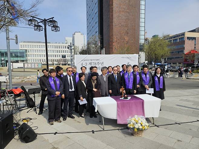 | ▲ 개신교 4.3 제78주년 추모기도회 참가자들이 기념촬영을 하고 있다. |