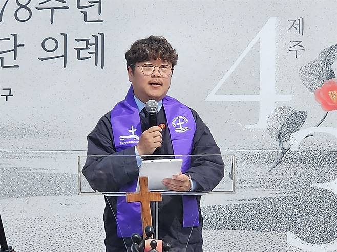 지난 3일, 제주4.3범국민위원회 주관으로 서울 종로구 송현광장에서 열린 '5대 종단 제주4.3 추모 의례'에서 개신교 대표로 나선 윤태현 목사(한국기독교장로회 제주노회 정의평화생명위원)의 목소리는 떨렸지만 단호했다.