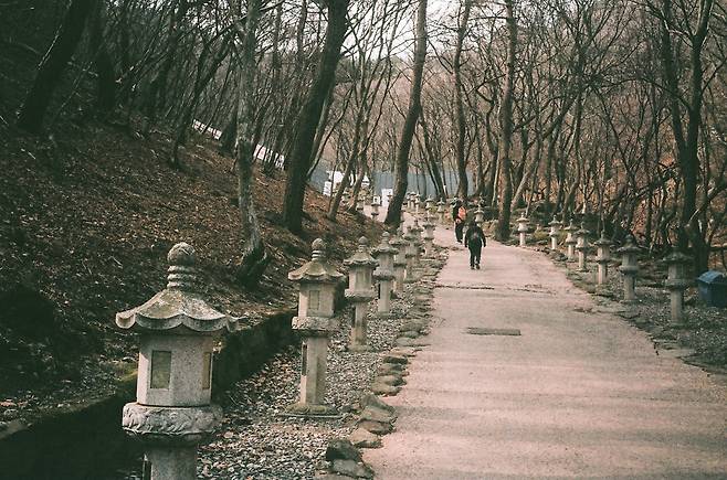 우리는 경산 와촌의 관음휴게소 코스를 택했다. 예전보다 산은 훨씬 가까워져 있었다. 주차장에서 등산로 입구까지 편리한 셔틀버스가 오갔지만, 나는 800미터 남짓한 길을 기꺼이 걷기로 했다. 길가에 늘어선 석등들이 마치 호위무사처럼 길을 안내하고 있었다. 목에 걸린 Trip 35의 렌즈를 통해 빛을 읽으며 천천히 발을 뗐다.