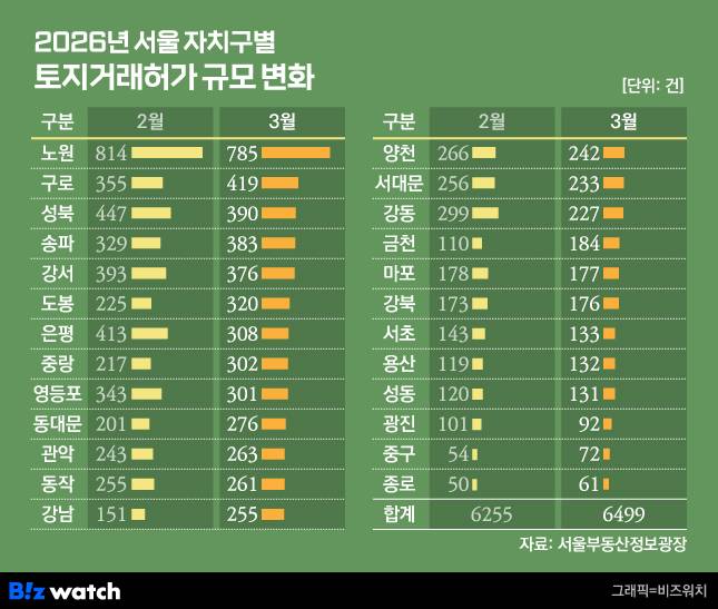 이렇게 강남 11개구의 토지거래허가는 3044건으로 전월(2887건) 대비 5.4% 증가했고요. 강북 14개구의 경우 3455건으로 전월(3455건) 대비 2.6% 늘어났습니다. 허가 규모가 가장 많았던 노원구는 783건으로 전월(814건) 대비 3.6% 감소했습니다.