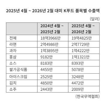 실제로 관세가 부과된 이후인 2025년 4월부터 올해 2월까지 11개월간 K푸드 대미 수출액은 19억4825만달러를 기록했다. 이는 전년 동기(18억3966만달러) 대비 1억859만달러(5.9%) 증가한 수치다.