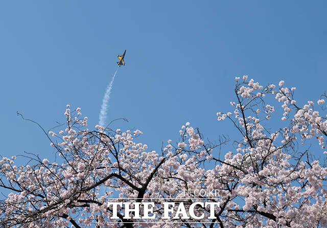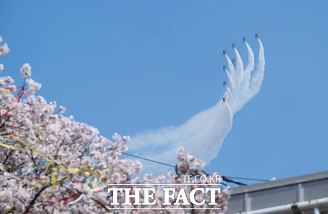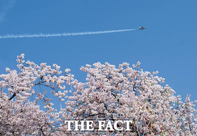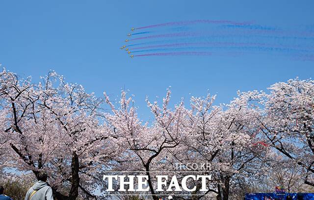 [더팩트ㅣ박헌우 기자] 공군 특수비행팀 블랙이글스가 5일 오후 서울 여의도 상공에서 '여의도 봄꽃축제' 축하비행을 펼치고 있다.